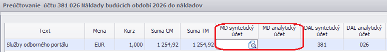 Pri preúčtovaní aktívneho účtu (381, 382) program ponúkne doplniť MD syntetický a analytický účet, a ak bol vybraný pasívny účet (384), program ponúkne doplniť DAL syntetický a analytický účet.