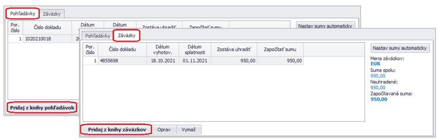 V záložke Texty je možné preddefinovať texty, ktoré budú zobrazené pri tlači Dohody. Doklady pridávame v dolnej časti cez voľbu Pridaj z knihy pohľadávok, kde vyberieme pohľadávku, ktorú započítavame. Cez voľbu Pridaj z knihy záväzkov vyberieme záväzok, ktorý započítavame.