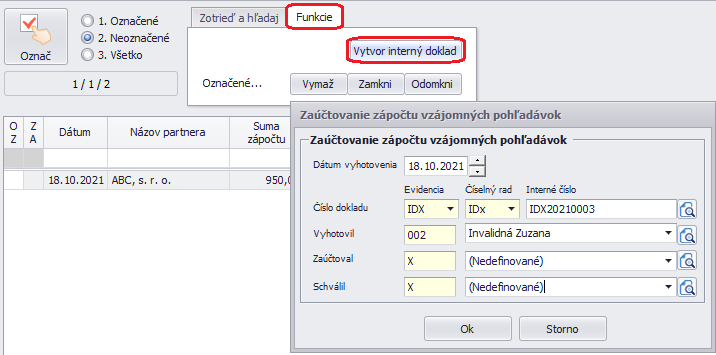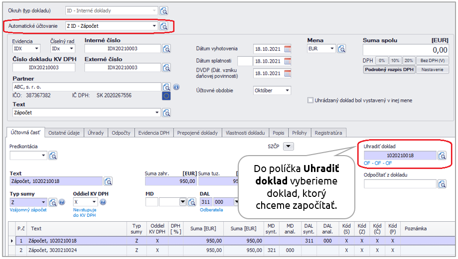 Vzájomné vysporiadanie vzniknutého záväzku a pohľadávky môžeme urobiť aj priamo v evidencii účtovných dokladov prostredníctvom interného dokladu. Na ich zaúčtovanie odporúčame použiť automatické účtovanie Z ID – Zápočet, ktoré nás prevedie účtovaním. Pri zastavení na bunke Uhradiť doklad si vyberieme doklady, ktoré chceme započítať. Započítať môžeme doklady len na rovnakého partnera a v rovnakej sume.
