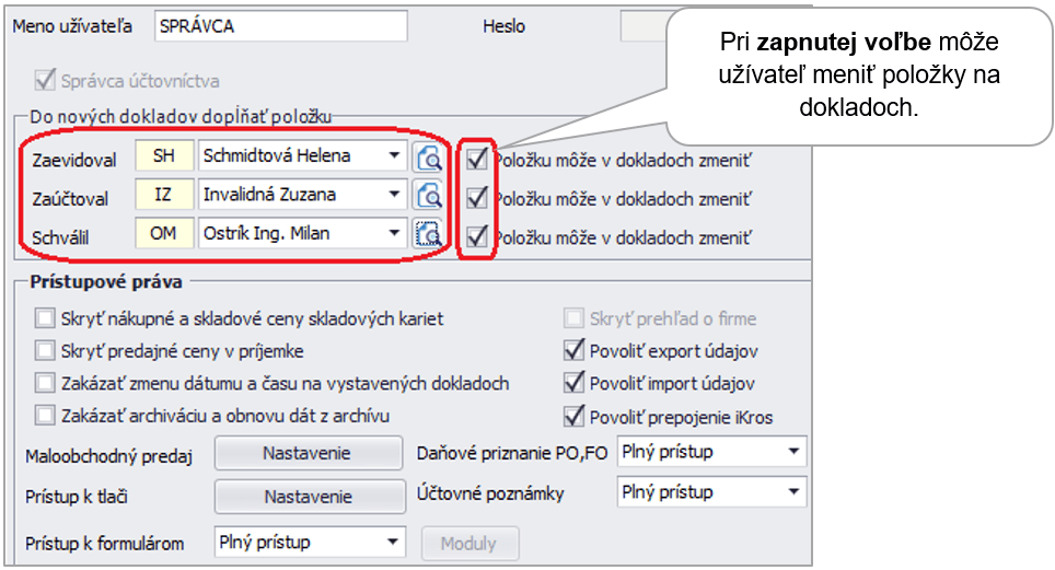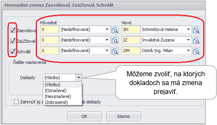 Zmena nastavenia mien Zaevidoval (Vyhotovil), Zaúčtoval a Schválil sa prejaví v nových dokladoch, ktoré sú vytvorené cez voľbu Pridaj doklad.