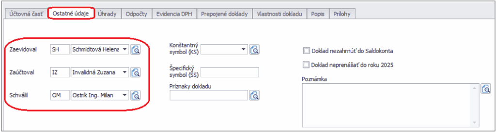 Doplnenie položiek Zaevidoval, Zaúčtoval, Schválil
