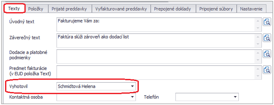 V doklade v menu Fakturácia sa položka Vyhotovil doplní v záložke Texty.