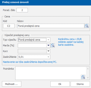 Pre prácu v module skladového hospodárstva je potrebné pre jednotlivé skladové karty zadefinovať predajné ceny. Spôsob, akým bude program tieto predajné ceny počítať, sa nastavuje pomocou cenových úrovní. Cenové úrovne skladu je možné vytvoriť a nastaviť cez menu Sklad – Cenové úrovne pomocou tlačidla Pridaj, ktoré sa nachádza v dolnej časti formulára.