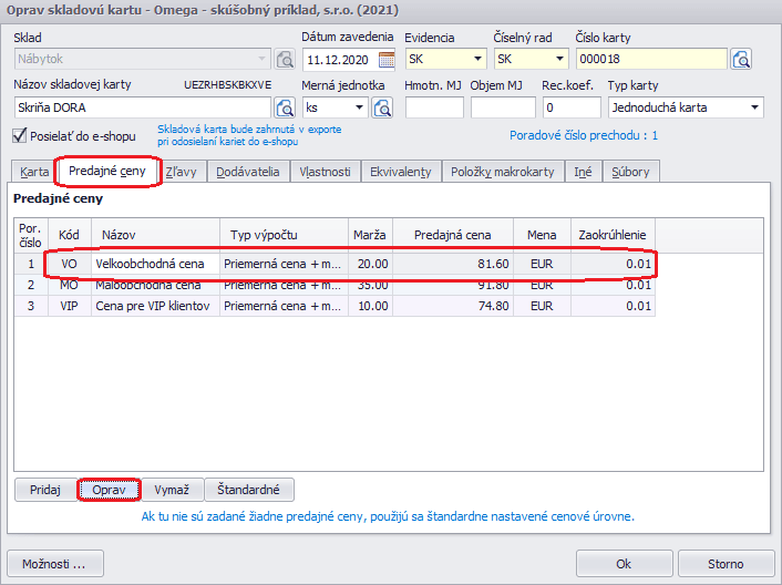 Predajnú cenu upravíme cez Sklad – Skladové karty pomocou tlačidla Oprav na konkrétnej skladovej karte. Následne v záložke Predajné ceny zvolíme, ktorú predajnú cenu chceme aktualizovať. Zmeniť môžeme fixnú predajnú cenu, ale aj priemernú cenu s maržou.