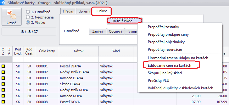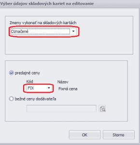 Fixnú predajnú cenu môžeme hromadne zmeniť cez menu Sklad – Skladové karty – Funkcie – Ďalšie funkcie a voľbu Editovanie cien na kartách.