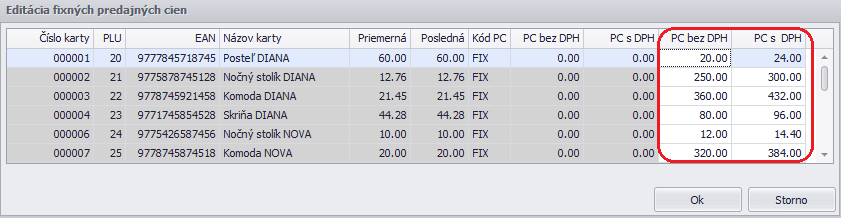V poslednom kroku sa zobrazí zoznam skladových kariet v ktorých ručne editujeme stĺpec PC bez DPH alebo PC s DPH. Po zvolení tlačidla OK sa zmena uloží a prejaví na skladových kartách.