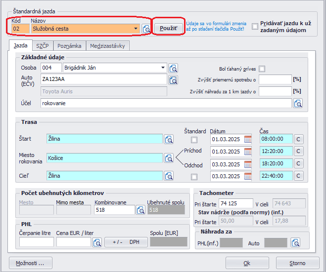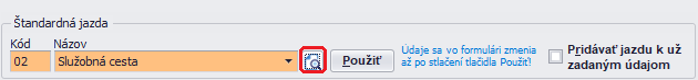 Zadefinujeme si často opakujúce sa údaje, ktoré pravidelne vypĺňame v jazde napr. osobu, rovnaký účel, čas odchodu alebo príchodu, rovnaké medzizastávky a pod. Štandardných jázd si môžeme vytvoriť ľubovoľný počet. Pri výbere jazdy a stlačení tlačidla Použiť sa nám automaticky vyplnia všetky polia, ktoré sme si na jazde prednastavili.