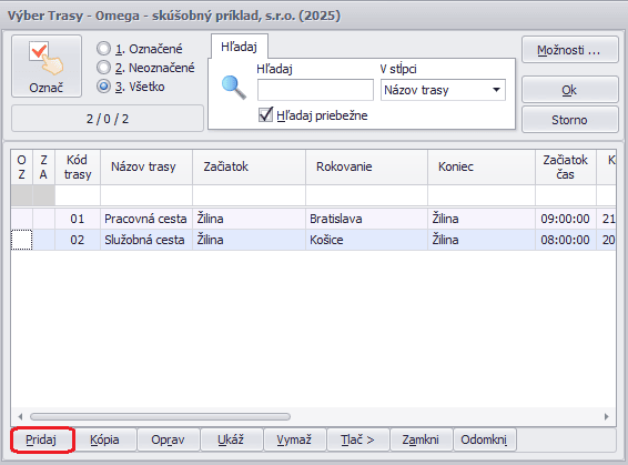Dostaneme sa do formulára Výber Trasy, kde si cez voľbu Pridaj vytvoríme štandardnú jazdu.