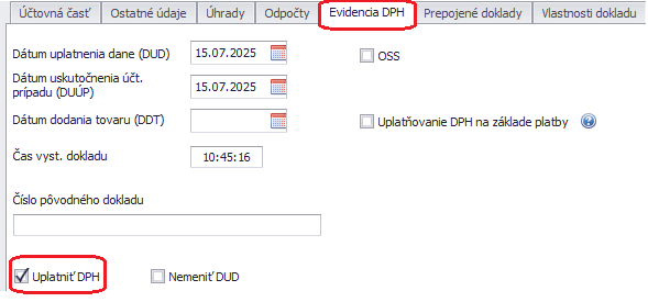 V záložke Evidencia DPH na doklade je potrebné mať zakliknutú voľbu Uplatniť DPH.
