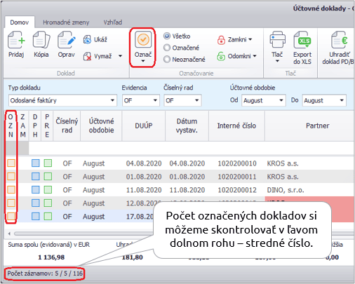 V evidencii účtovných dokladov si vyfiltrujeme faktúry za mesiac august, ktoré si hromadne označíme. Najskôr však doklady odznačíme cez funkciu Označ – Odznač všetko, aby sme oddiel KV DPH nezmenili aj na iných dokladoch. Následne doklady označíme cez Označ – Označ zobrazené.