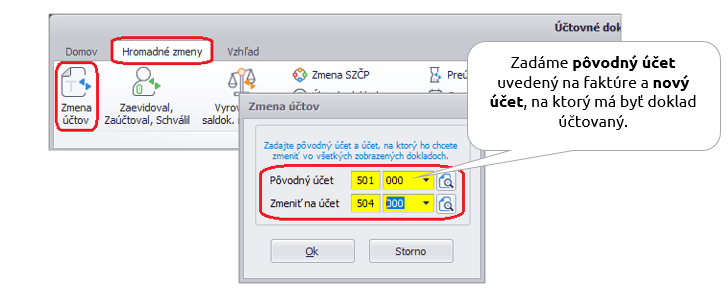 Najskôr si vyfiltrujeme faktúry na partnera Marstav a.s. v evidencii účtovných dokladov. Potom cez záložku Hromadné zmeny volíme funkciu Zmena účtov. Po zadaní pôvodného a nového účtu prebehne zmena na všetkých zobrazených dokladoch.