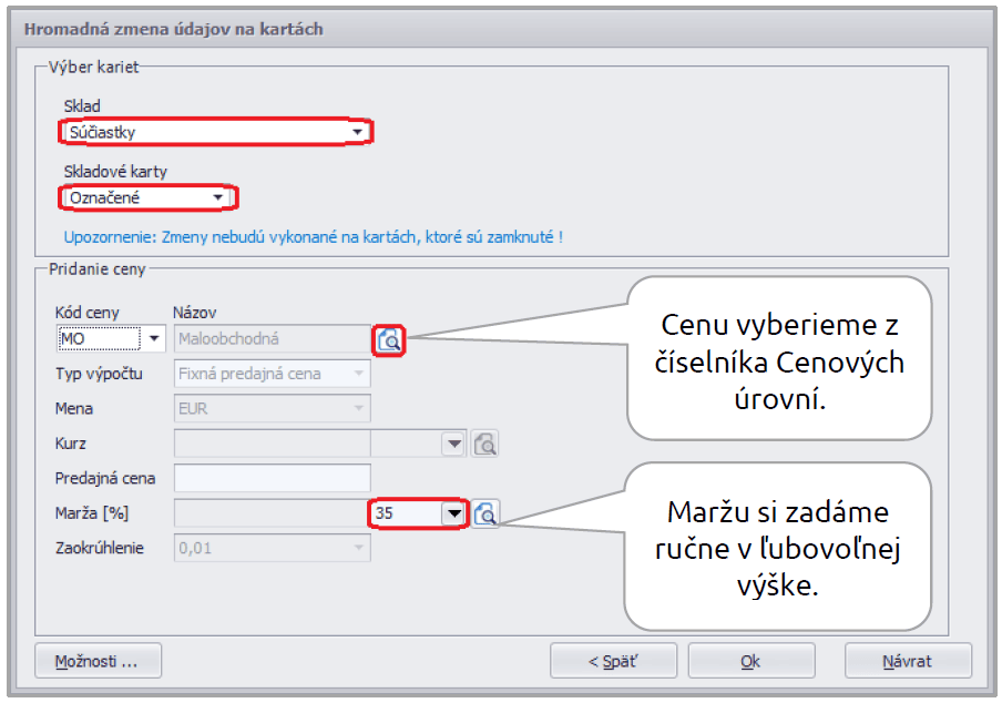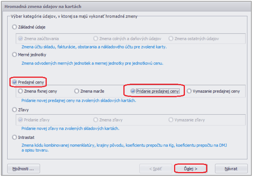 Na príklade si ukážeme pridanie novej predajnej ceny na skladové karty. Obdobným spôsobom postupujeme aj pri ostatných hromadných funkciách.