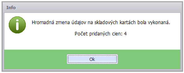 Po vykonaní hromadnej funkcie program OMEGA informuje, na koľkých skladových kartách bola daná zmena vykonaná.