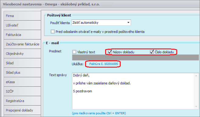 V programe OMEGA si môžete zasielanie dokladov zjednodušiť prednastavením predmetu mailu ale aj textu správy cez menu Firma – Nastavenie – Všeobecné nastavenia – záložka Emailová komunikácia.