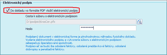 V menu Firma – Nastavenie – Všeobecné nastavenia – v záložke Emailová komunikácia je možné nastaviť Elektronický podpis. K dokladu odoslanom z fakturácie do emailu alebo uloženom do súboru vo formáte PDF bude potom pripojený aj elektronický podpis.