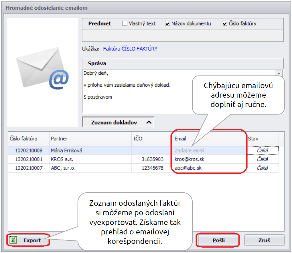 - Zobrazí sa okno Hromadné odoslanie emailom aj so zoznamom odosielaných dokladov.