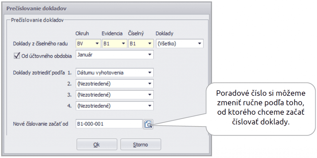 V zobrazenom formulári si zvolíme kritériá, podľa ktorých sa majú doklady prečíslovať. Vyberieme si Okruh, Evidenciu, Číselný rad a Obdobie, od ktorého sa doklady prečíslujú.