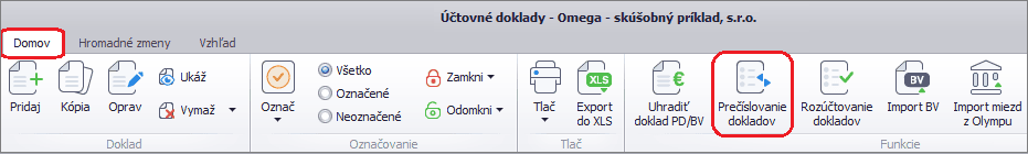 Hromadné prečíslovanie dokladov vykonáme cez menu Evidencia – Účtovné doklady – Domov – Prečíslovanie dokladov.