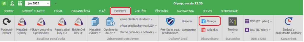 V prvom kroku je potrebné vykonať export z programu OLYMP. Export vykonáme cez záložku Exporty – Omega: