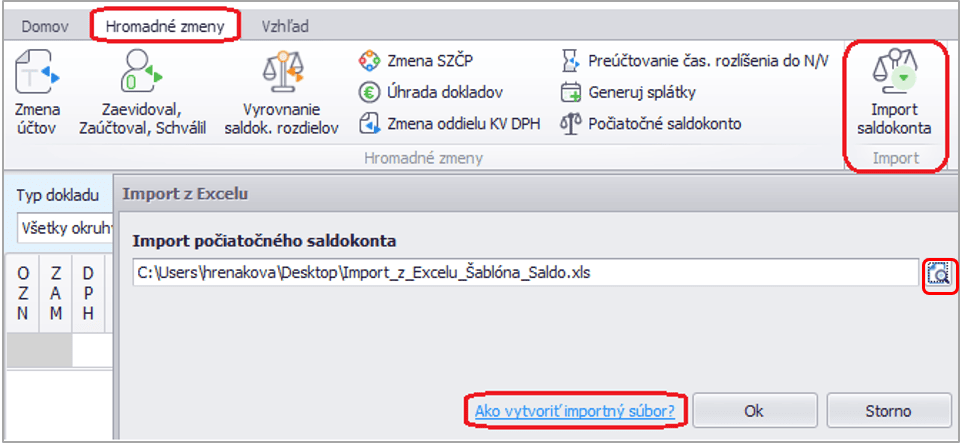 - Import Počiatočného saldokonta z Excelu – funkciu nájdeme v hlavnom menu Evidencia – Účtovné doklady – záložka Hromadné zmeny. Po kliknutí na tlačidlo Import saldokonta sa otvorí formulár, kde vyberáme cestu k importnému súboru.