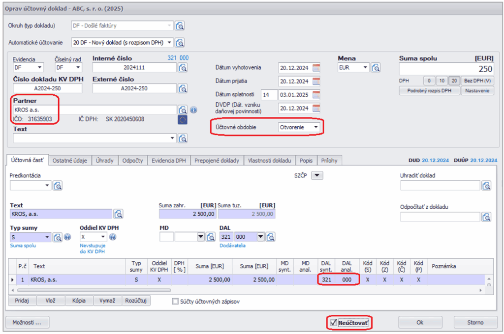 - Ručné zaevidovanie dokladov – doklady môžeme nahrať ručne v Evidencii účtovných dokladov. Na doklade vyplníme Partnera, nastavíme obdobie Otvorenie a zapneme voľbu Neúčtovať. Stačí ak doklad obsahuje saldokontný účet (napr. 321,311), nemusí byť celý predkontovaný nakoľko sa neúčtuje.