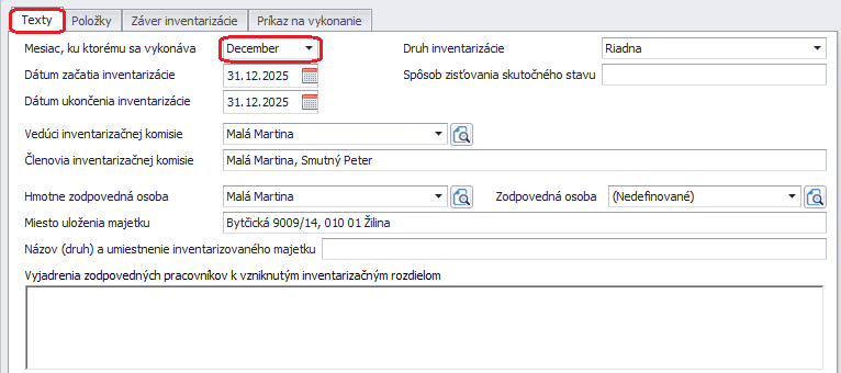 - V záložke Texty sa vypĺňajú dátumové polia týkajúce sa inventarizácie, informácie o zložení inventarizačnej komisie a ich vyjadrenia k prípadným inventarizačným rozdielom, ktoré boli inventarizáciou zistené. Dôležitý je správny výber mesiaca, ku ktorému sa inventarizácia vykonáva. Podľa neho sa načítavajú zostatky do inventarizačného zápisu.