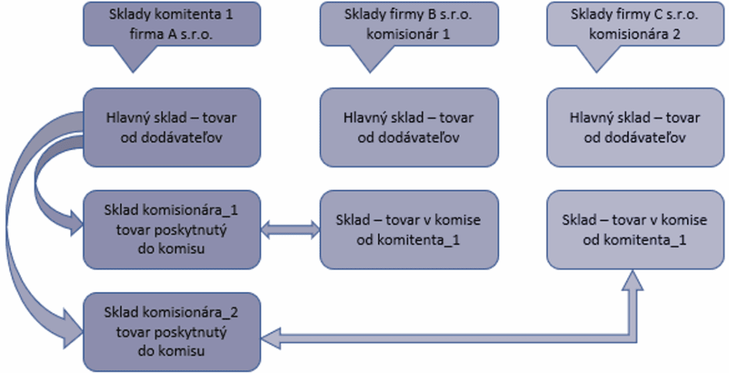 Sklady komitenta, ktorý poskytuje tovar do „komisu“ dvom komisionárom, teda môžu vyzerať nasledovne: