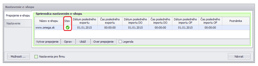 Po nastavení e-shopu v internetovom prehliadači program OMEGA overí prepojenie s e-shopom. Aktívny e-shop získa zelený príznak. Následne môžeme odosielať skladové zostatky do e-shopu a importovať objednávky do programu OMEGA.