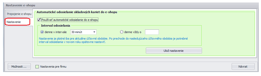 V záložke Firma – Nastavenia – Sprievodca nastavením eshopu si môžeme nastaviť interval odosielania skladových kariet do e-shopu na základe vytvorených kritérií. Tento interval môžeme nastaviť denne napr. na 15 alebo 30 minút a podobne. Prípadne vieme nastaviť odosielanie zostatkov na konkrétny čas. Predtým, ako vykonáme toto nastavenie, je potrebné program OMEGA spustiť ako Správca (Admin).