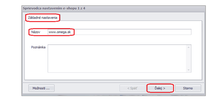 - V prvej záložke Základné nastavenia uvedieme názov e-shopu, ktorý budeme používať. Následne zvolíme tlačidlo Ďalej.
