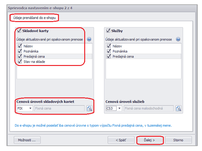 - V druhej záložke Údaje prenášané do e-shopu označíme údaje na skladových kartách alebo službách, ktoré sa budú aktualizovať pri opakovanom prenose do e-shopu. Aktualizovať sa môže názov, poznámka, predajná cena, stav na sklade. Zmenený stav na sklade sa prenáša len pri skladových kartách.