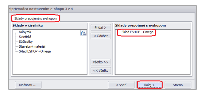- V záložke Sklady prepojené s e-shopom vyberieme sklady, ktoré chceme s e-shopom prepojiť.