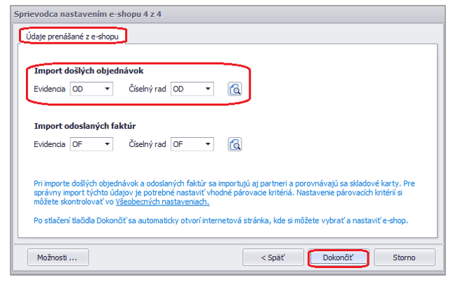 - V záložke Údaje prenášané z e-shopu môžeme nastaviť samostatnú evidenciu pre došlé objednávky a faktúry.