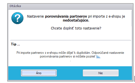 Po stlačení tlačidla Dokončiť sa nás program spýta na porovnávacie kritéria pre import partnerov a skladových kariet. Zobrazí sa nám nasledovná hláška: