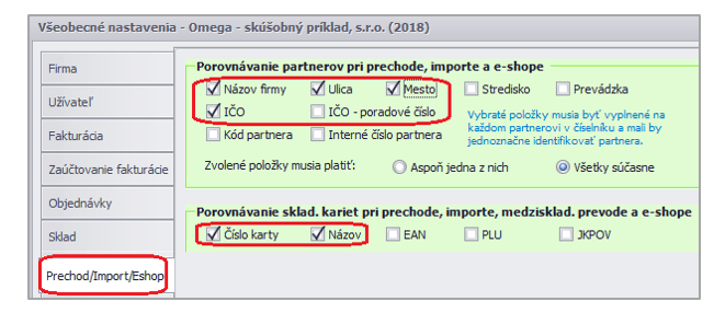 Ak zvolíme tlačidlo Áno, program nás presunie do Všeobecných nastavení programu OMEGA ( Firma – Nastavenia – Všeobecné nastavenia – Prechod/Import/Eshop), kde skontrolujeme porovnávacie kritéria.