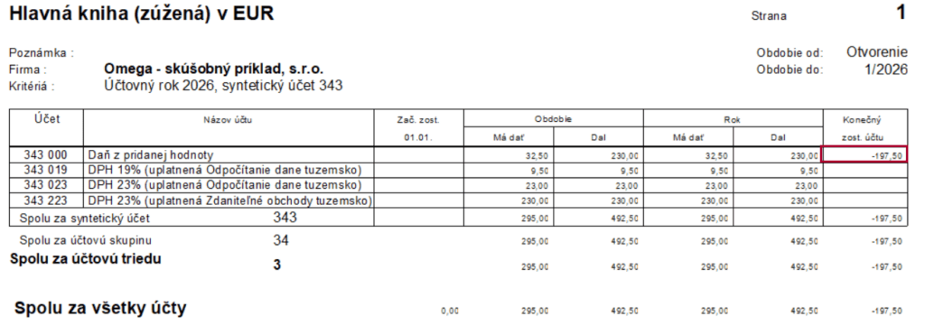 - Hlavná kniha – zostatok účtu 343.000 za mesiac, resp. kvartál.