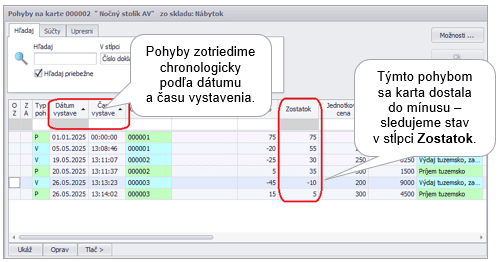 Dvojklikom na chybu priamo v kontrole sa zobrazia pohyby danej skladovej karty. Podsvietený bude prvý pohyb, ktorým sa skladová karta dostala do mínusu – hodnota v stĺpci Zostatok bude záporná. Pravým tlačidlom myši zotriedime pohyby chronologicky podľa dátumu a následne času vystavenia. Šípky musia ukazovať rovnaký smer.