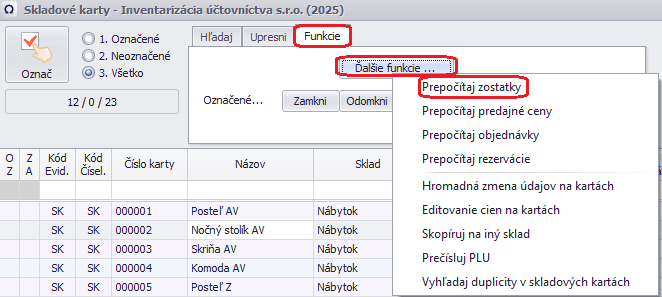 Po odstránení prepočítame zostatky na týchto skladových kartách pomocou funkcie Prepočítaj zostatky. Spustíme ju cez menu Sklad – Skladové karty – záložka Funkcie – Ďalšie funkcie.