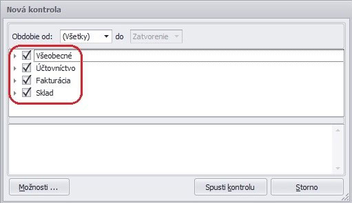 Kontrolu v programe OMEGA spustíme cez menu Firma – Kontrola – Nová kontrola. Môžeme ju spustiť podľa potreby, minimálne však raz mesačne. Pred samotným spustením si vyberáme, akú oblasť chceme kontrolovať.