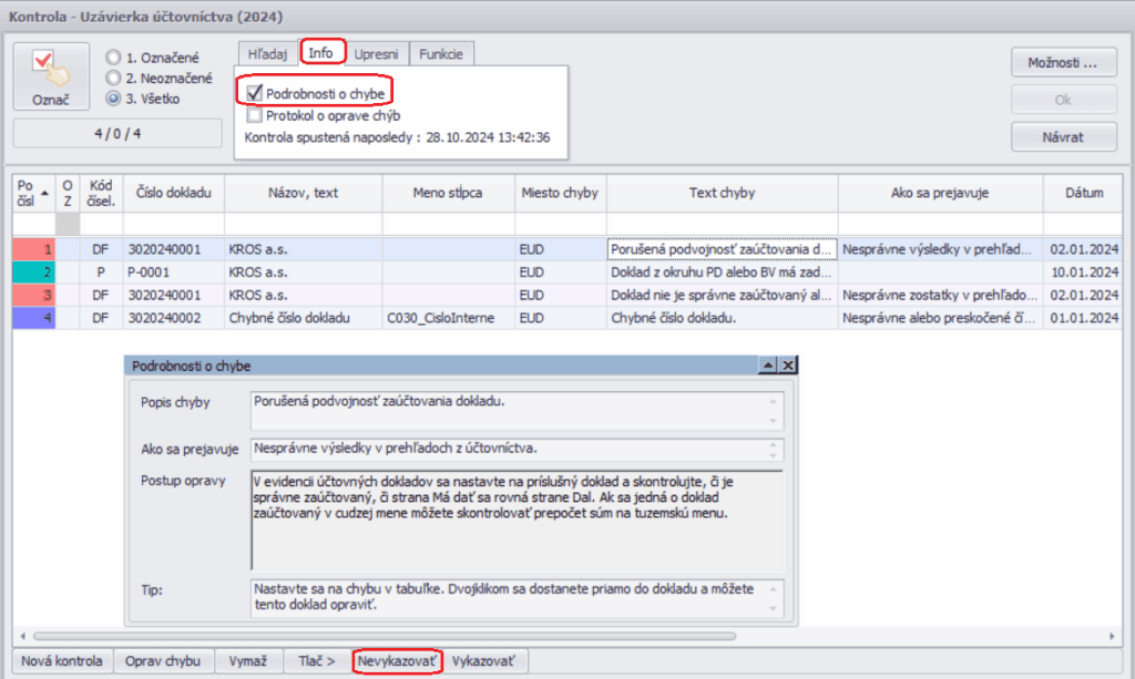 Ak chyba, ktorú program našiel, z nášho pohľadu nie je chybou (sme si istí, že je to správne zaúčtované), môžeme tento záznam kontroly označiť ako nevykazovaný pomocou tlačidla Nevykazovať.