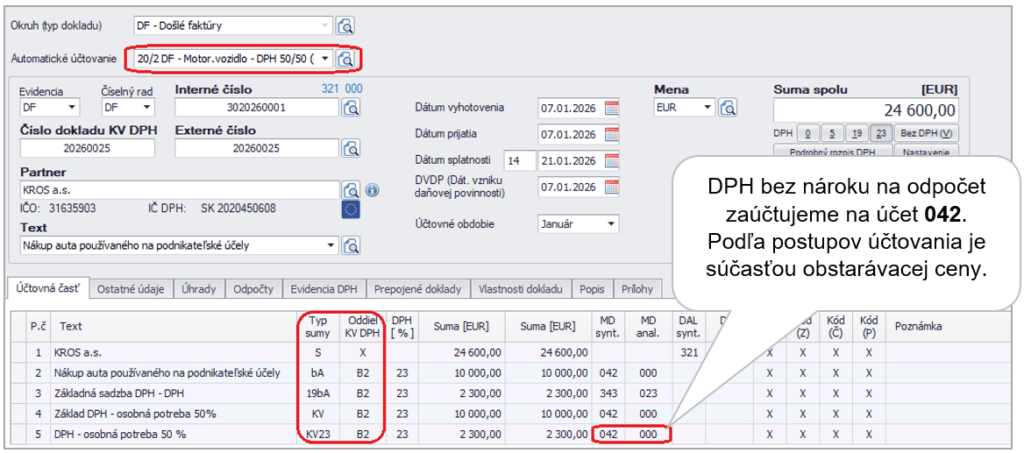 Platiteľ DPH si v januári 2026 obstaral vozidlo v sume 20 000 eur bez DPH, ktoré bude používať výlučne na podnikanie. Pre administratívnu náročnosť sa rozhodol, že nebude viesť záznamy potrebné pre 100 % odpočítanie DPH a bude si odpočítavať DPH vo výške 50 %. DPH z nákupu vozidla je 4 600 eur. Ako bude postupovať pri zaúčtovaní faktúry a zaradení auta do majetku v programe Podvojné účtovníctvo OMEGA?