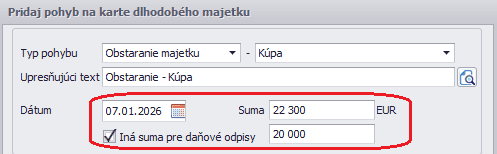 Pridáme pohyb Obstaranie, kde doplníme obstarávaciu cenu auta vo výške 22 300 eur (20 000 základ dane + 2 300 DPH bez nároku na odpočet). Z dôvodu rozdielnej účtovnej a daňovej vstupnej ceny zapneme voľbu „Iná suma pre daňové odpisy“, kde doplníme sumu 20 000 eur.