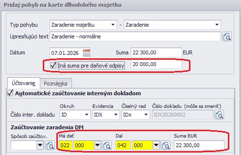 Pridáme pohyb Zaradenie – kde opäť zapneme voľbu „Iná suma pre daňové odpisy“. Program automaticky doplní sumu 20 000 eur.