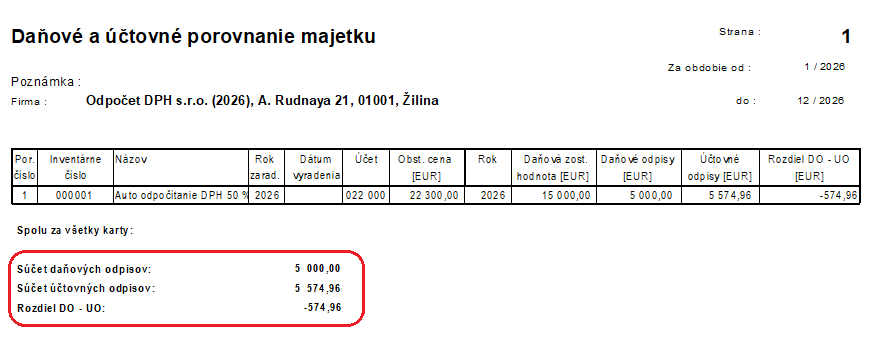 V tomto prípade nie je možné vybrať typ odpisu ÚO = DO, pretože daňová vstupná cena sa líši od účtovnej vstupnej ceny. Suma daňového a účtovného odpisu sa preto nebude rovnať. Je možné zvoliť typ účtovného odpisu Lineárny alebo Fixnou čiastkou.