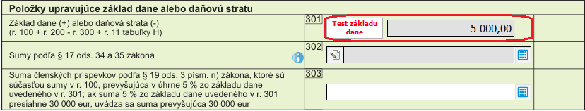 Test výšky základu dane prebehne automaticky po potvrdení tlačidla v riadku 301. Hláška informuje o tom, či sa vykoná alebo nevykoná zvýšenie základu dane. Ak bude potrebné zvýšenie základu dane, sumu do riadka 302 program vyplní automaticky.