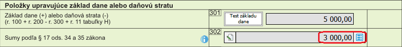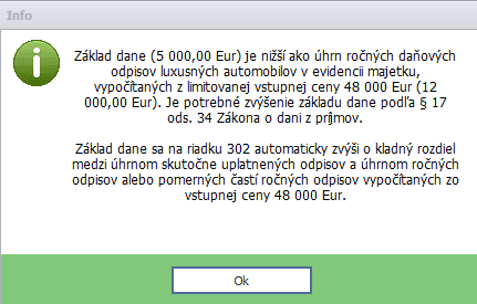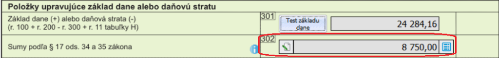 Ak je základ dane < 24 000 eur (prípadne 24 000 x (krát) počet luxusných automobilov) vykoná sa úprava základu dane automaticky, po potvrdení tlačidla na riadku 301. Základ dane sa zvýši o kladný rozdiel medzi vypočítaným daňovým odpisom a odpisom z limitovanej vstupnej ceny luxusného elektromobilu na riadku 302.