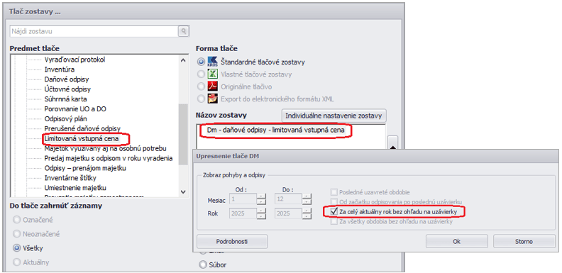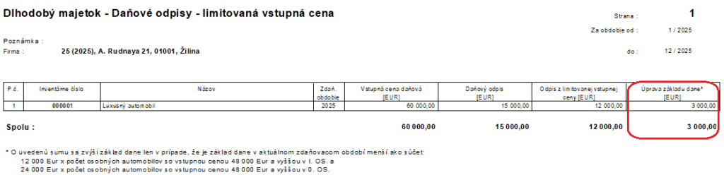 Pre porovnanie a kontrolu je možné využiť tlačovú zostavu Dm – daňové odpisy – limitovaná vstupná cena, ktorá obsahuje vypočítanú sumu, o ktorú je potrebné upraviť základ dane v prípade, ak je ZD < 12 000 eur a/alebo 24 000 eur.