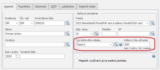 Pri vytváraní karty dlhodobého majetku, ktorý sa bude odpisovať časovou metódou, v časti Daňové zaradenie vyberieme Typ daňového odpisu Časový a zadáme Celkový čas užívania t.j. počet hodín, dní, mesiacov a pod.