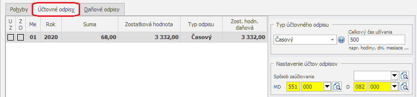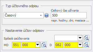 V záložke Účtovné odpisy nastavíme typ Účtovného odpisu tiež Časový a doplníme celkový čas používania – 500 hodín.