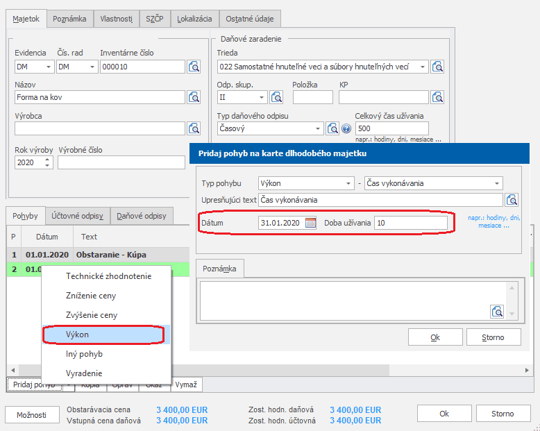 Aby program vypočítal odpisy na konci každého obdobia (mesiac, štvrťrok, …) pridáme v karte majetku v záložke Pohyby pohyb Výkon – Čas vykonávania. Do bunky Dátum doplníme dátum, ku ktorému chceme vypočítať účtovný odpis a do bunky Doba užívania zadáme skutočnú dobu používania za konkrétne obdobie. V našom prípade sa forma na kov využíva mesačne 10 hodín. Preto doplníme dátum 31. 1. 2020 a 10 hodín ako dobu užívania.